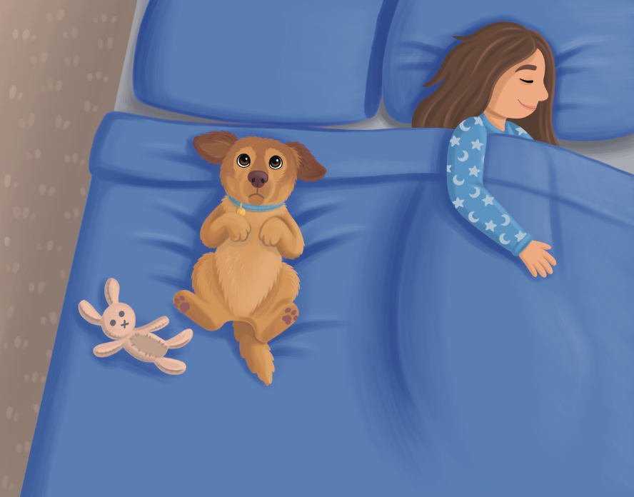 Early in the morning, when the sun was coming up, a tired mama laid in bed snuggled up to her pup. His name is Mr. Moose, and he was ready to play. But mama said “5 more minutes, then we’ll start our day!”